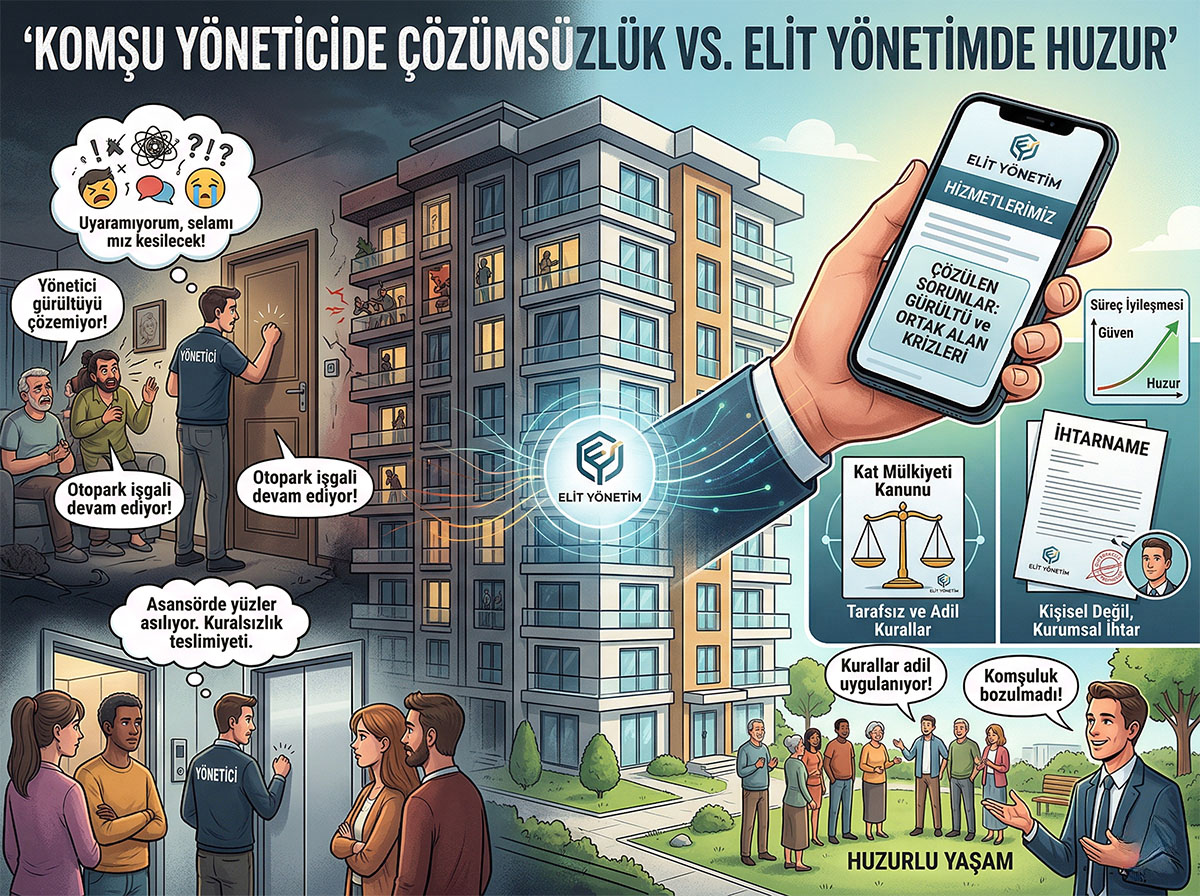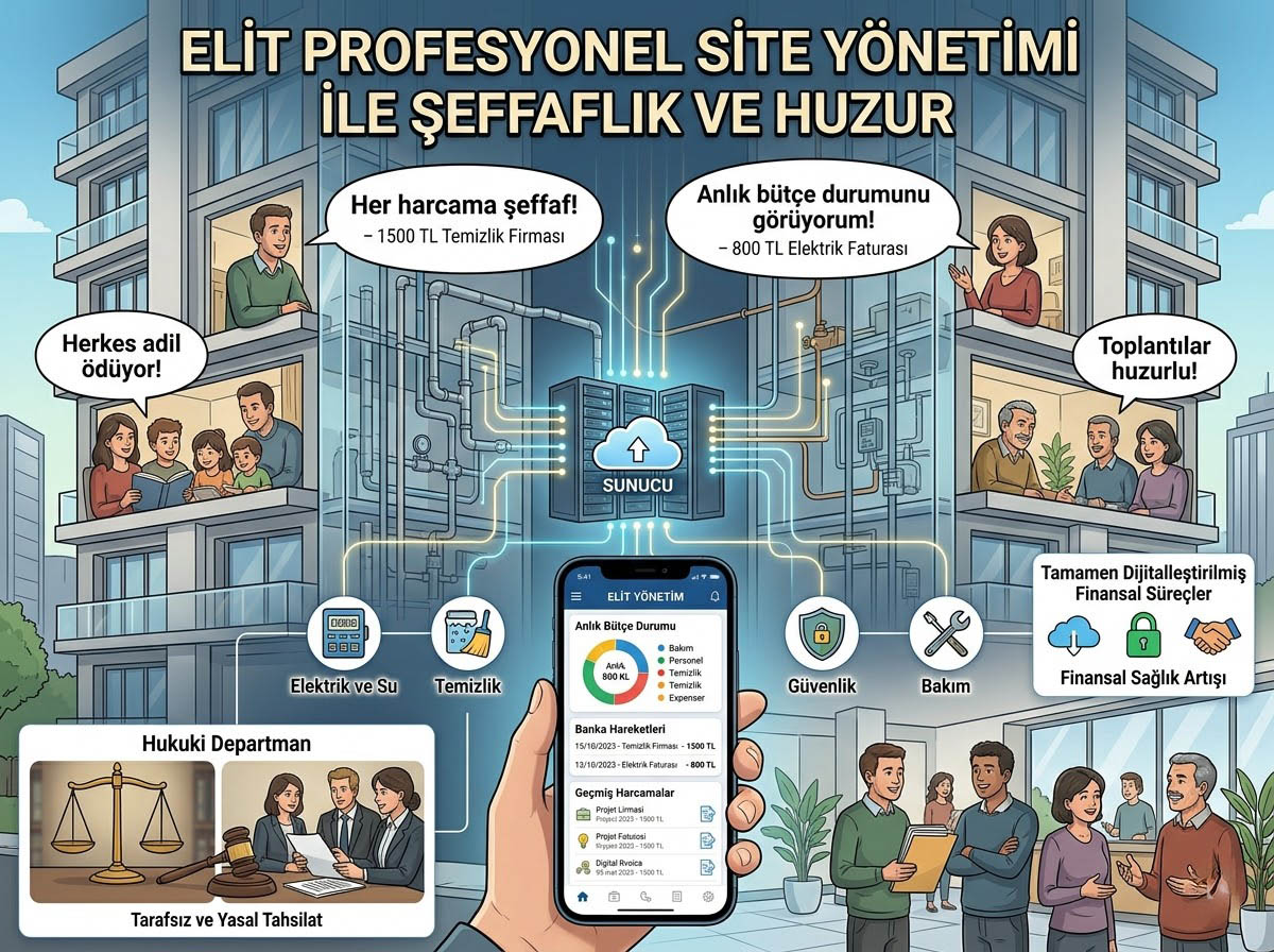 Riski şansa bırakamazsınız. Elit Profesyonel Site Yönetimi, binalarınızın tüm yasal, teknik ve idari sorumluluğunu üstlenir. Asansör periyodik bakımları uzman mühendislerce takip edilir, çalışan tüm personelin SGK ve İSG (İş Sağlığı ve Güvenliği) prosedürleri eksiksiz yerine getirilir. Evinizin değerini korurken, sizi on binlerce liralık cezalardan ve hukuki süreçlerden uzak tutuyoruz.