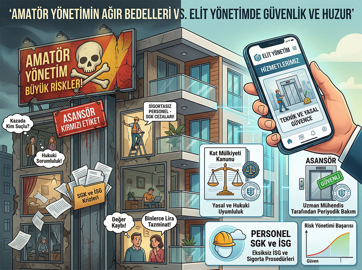 Riski şansa bırakamazsınız. Elit Profesyonel Site Yönetimi, binalarınızın tüm yasal, teknik ve idari sorumluluğunu üstlenir. Asansör periyodik bakımları uzman mühendislerce takip edilir, çalışan tüm personelin SGK ve İSG (İş Sağlığı ve Güvenliği) prosedürleri eksiksiz yerine getirilir. Evinizin değerini korurken, sizi on binlerce liralık cezalardan ve hukuki süreçlerden uzak tutuyoruz.